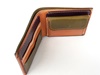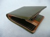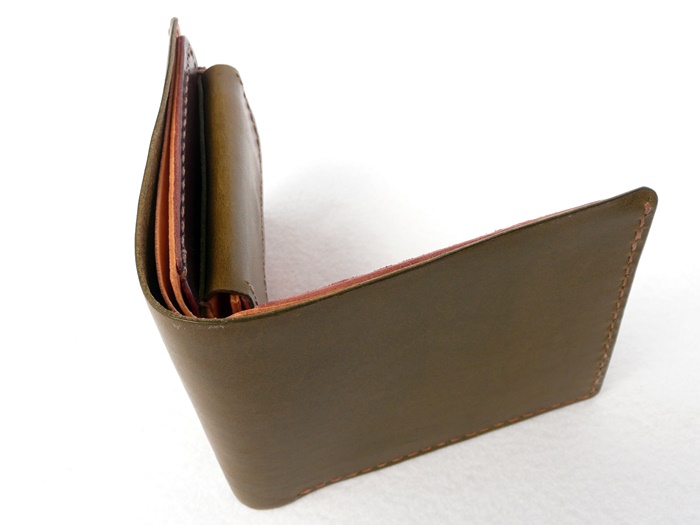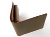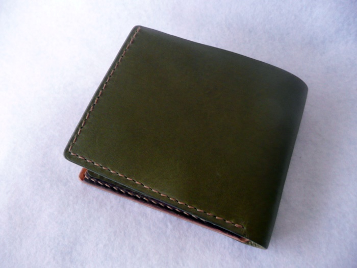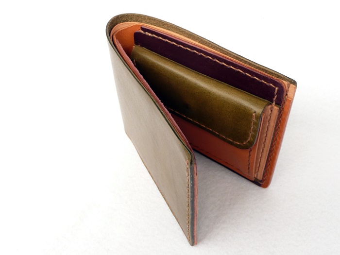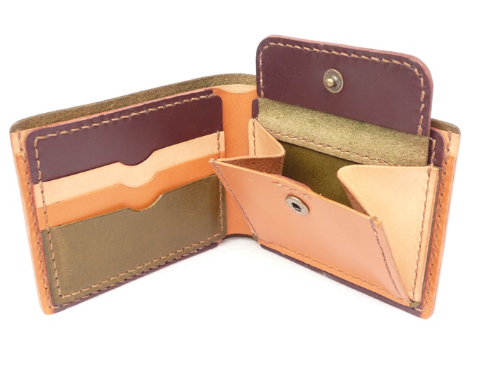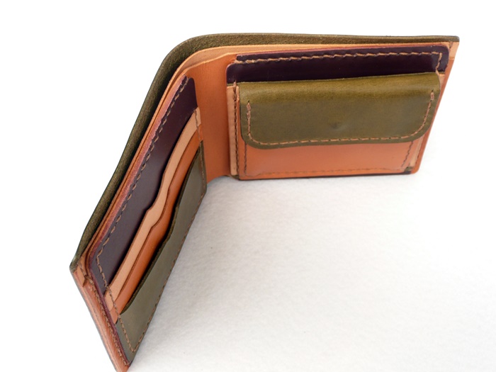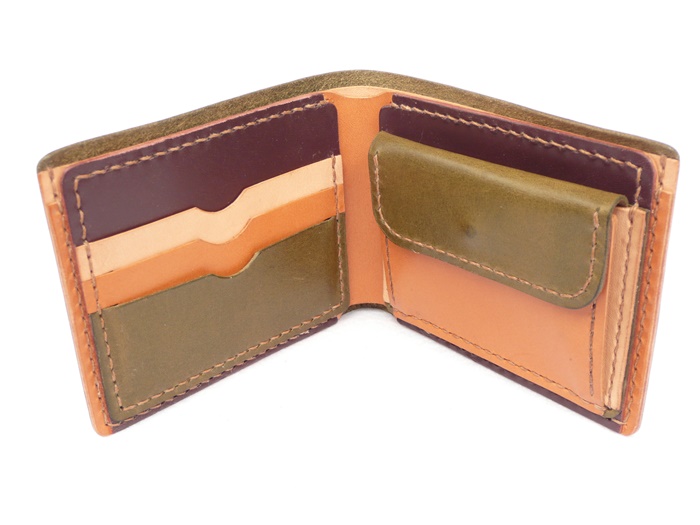 使いやすさを追求した横に広く、小銭入れも大きく開口して小銭が出し入れしやすいデザインの折財布です。 外革がモスグリーン。 中にモスグリーン、ワインレッド、ブラウン、ナチュラル、 の4色使いの折財布です。 中の配色はご希望で変更可能です。